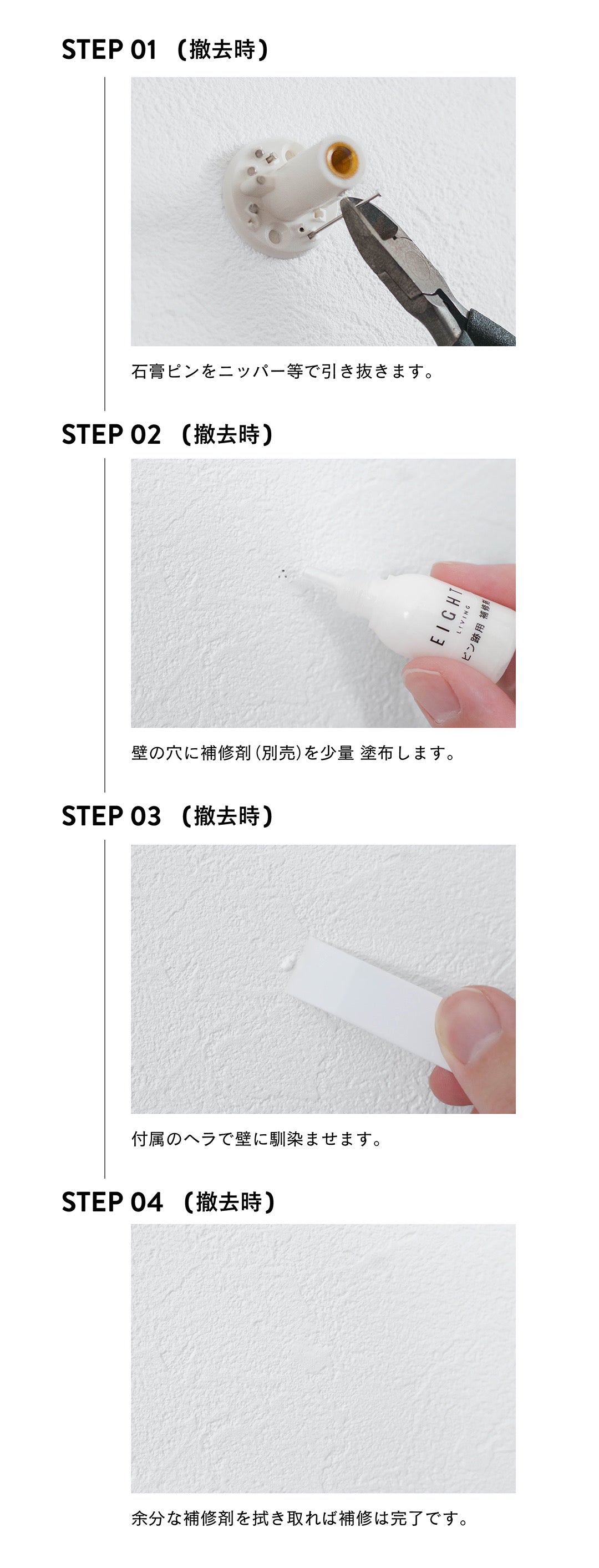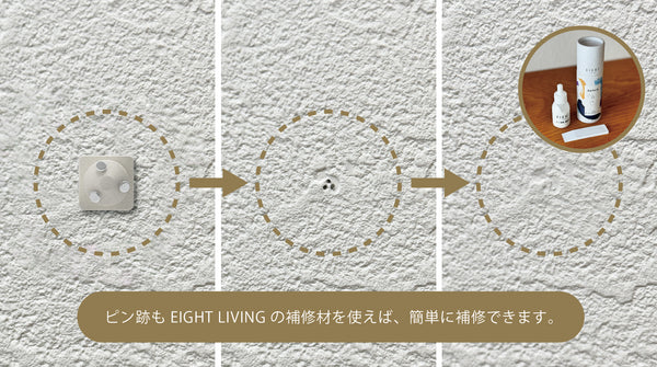 原状回復には、EIGHT LIVINGの《ピン跡用 補修剤 》を使用することで、どこに穴があったかもわからないほど綺麗に穴を塞ぐことが出来ます。
