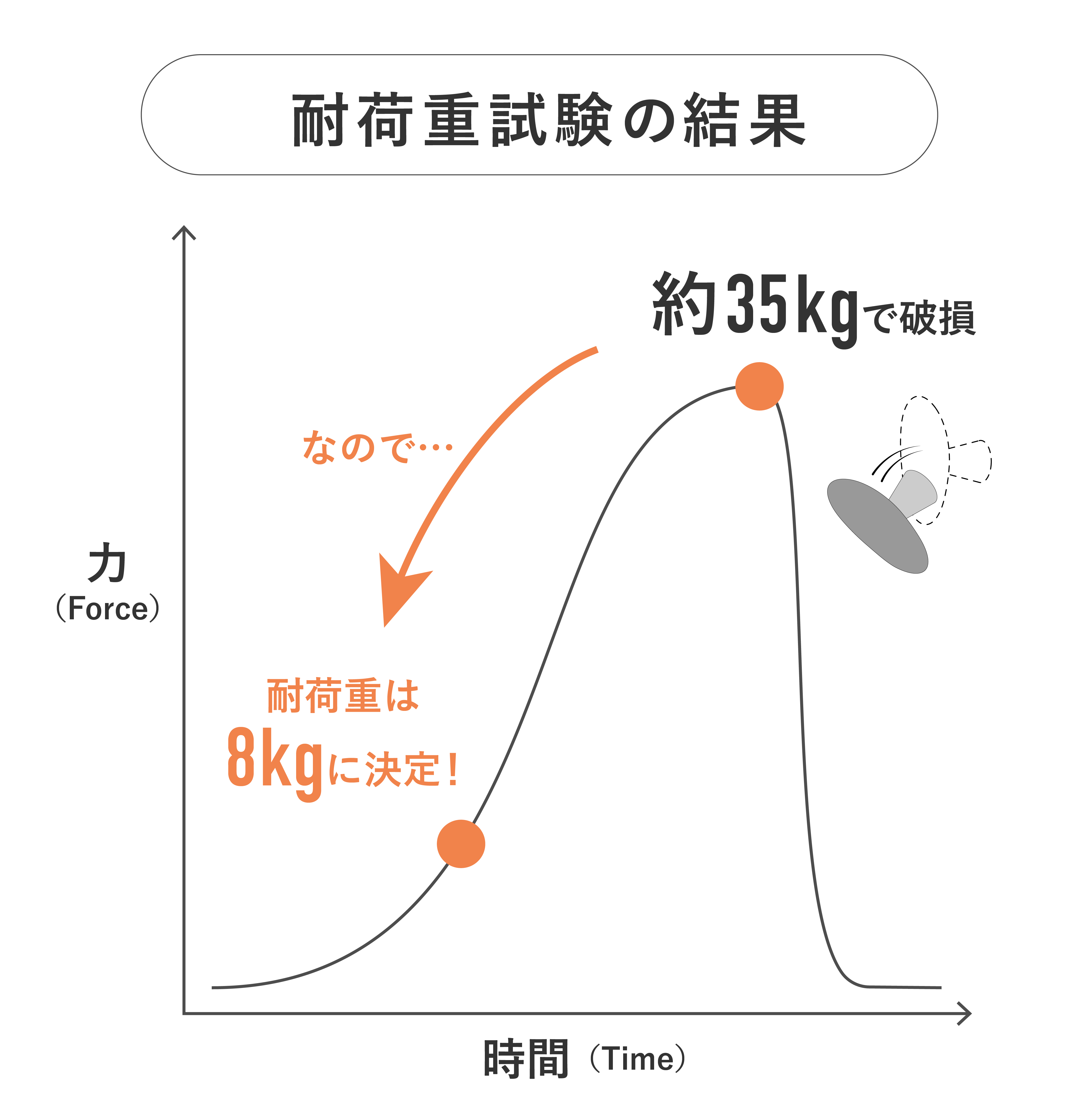 耐荷重試験の結果をもとに、耐荷重は「8㎏」で設定しております。