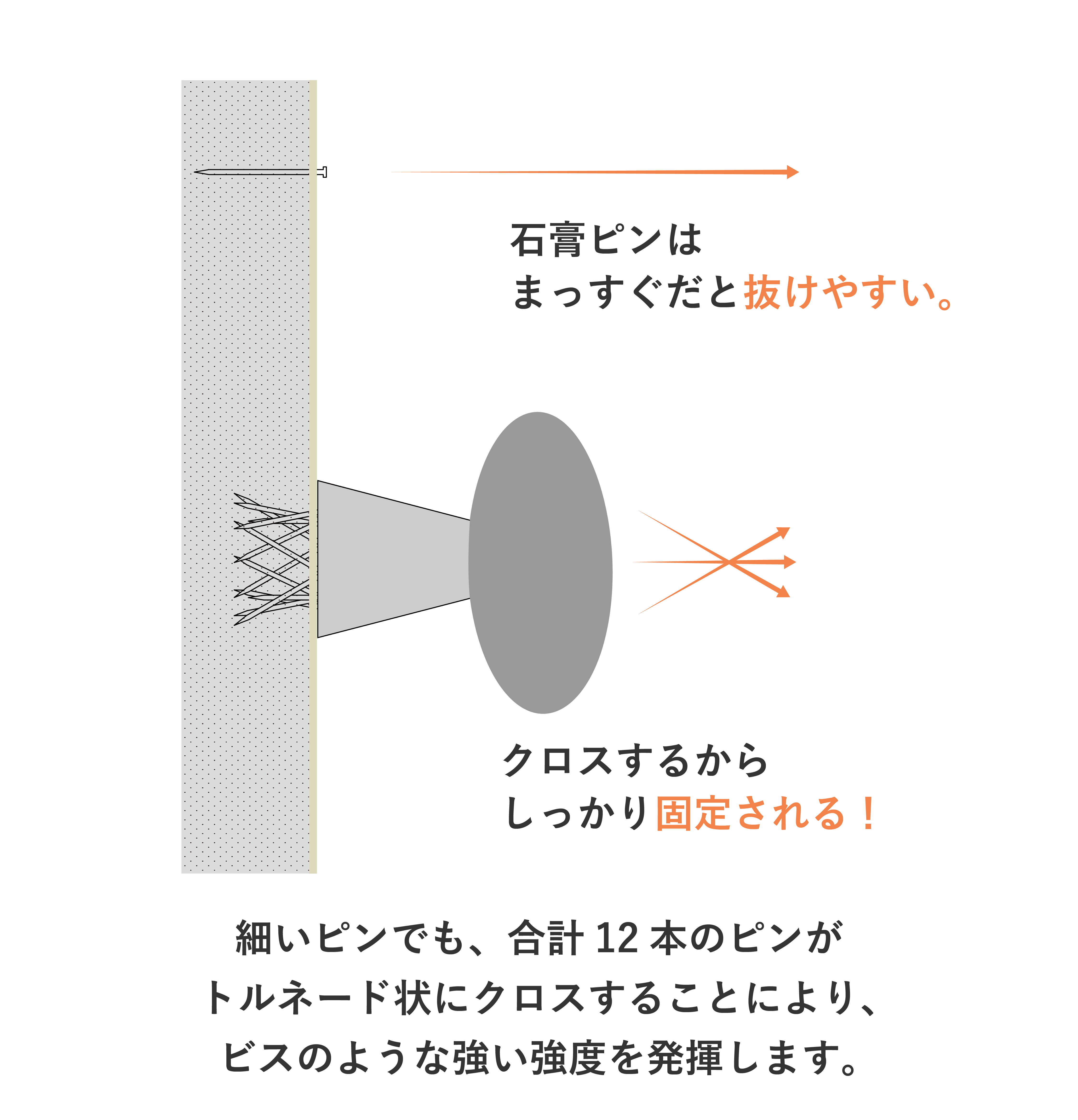 画鋲より細い“石膏ピン”で取り付けることで、石膏ボードならどこでも好きな場所に取り付け可能。もちろん、原状回復も可能です。